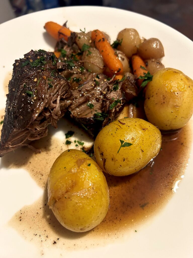 I realized I could still burn off the alcohol but I would need high heat. Remembering I had some store-bought beef stock left in the fridge from something I cooked last week, I set the meat aside again, strained the good veggies back out of the sauce, and turned the heat up to high. I added in a cup or two of beef stock- whatever was left in the carton- and seasoned with some salt. After the liquid had reduced by about half (or potentially a little more because I was still feeling out of sorts and nervous about the alcohol) I tasted it and all was right with the world. The flavor was concentrated, rich, and still had depth and sweetness from the red wine. But no sharp tinge of alcohol. The beef was great too- sweet and incredibly tender, although it had dried out a little at this point. An absolute win overall, though, taste and texture-wise.