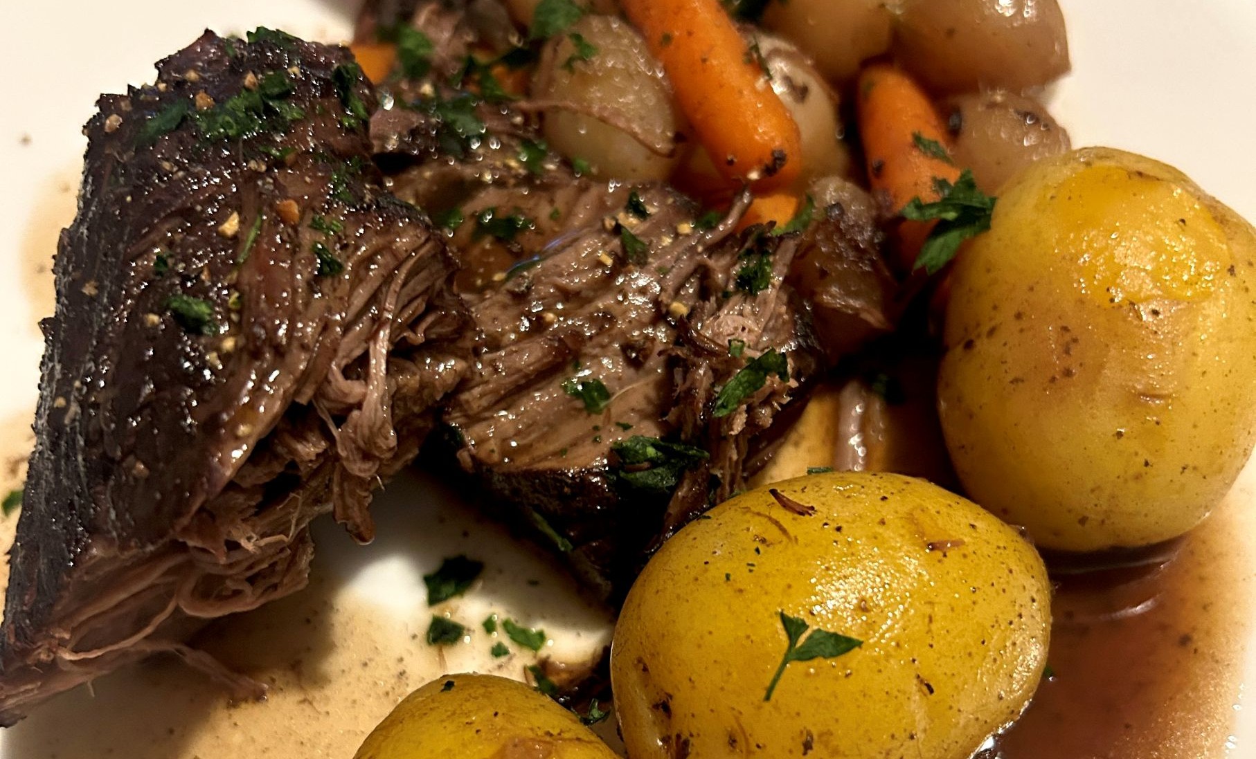 The gist of this recipe: Beef shoulder marinated overnight in red wine with veggies, aromatics, and spices. The next day, sear off the shoulder in an oven-safe vessel, pour the marinade back in, and cook it with the lid on low-and-slow in the oven for 3 hours. Then you strain the sauce to remove spent ingredients, add freshly blanched veggies, and serve by slicing the beef and surrounding it with the juice and vedge.