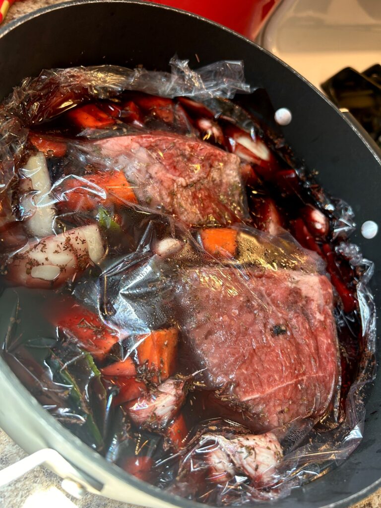 Jennifer and I went to our church’s small group last night and wound up getting home very late, which isn’t uncommon. I mismanaged the start time of dinner as well- I misread the cook time because it was sort of spread out over several steps and… well, see above. So, we didn’t eat dinner until we got home… late. It had been a long day, so right after dinner we started to get ready for bed when I realized I still needed to marinate the beef for today’s meal. After some cutting, peeling, smashing, and measuring, I was ready to add the wine: three cups of wine. I measured it and, in my haste to be done with the final step, hard-poured the wine over the meat and veggies. And the frumpy dog on the front of my inexpensive bottle of Cabernet Sauvignon spoke, or growled maybe, “you can’t rush French cuisine, American slob.” And the wine erupted from the surface of the beef onto the counter, the cutting board, and my phone’s screen where I was reading the recipe.